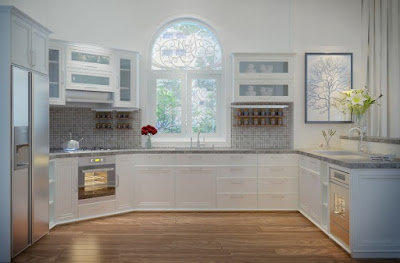 Gam màu kem kết hợp với trắng cho nhà bếp phong cách cổ điển. Sự kết hợp kính và quầy bar tạo cho không gian sự tinh tế, sang trọng .