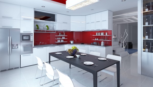 Phòng bếp với gam màu cá tính: trắng, đỏ, đen, kết hợp hệ tủ kệ đa năng gọn gàng cho không gian thêm rộng rãi. Phong cách bài trí này đem lại cảm giác thư thái, giúp bữa ăn thêm ngon miệng.